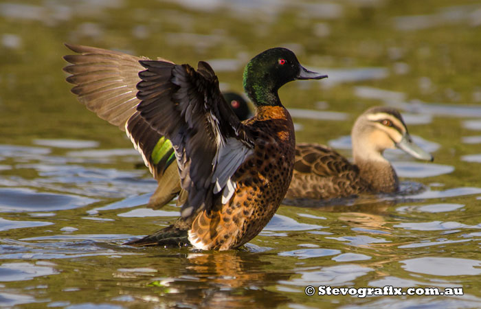 Male Chestnut Teal stretching his wings, Budgewoi, NSW June 2014